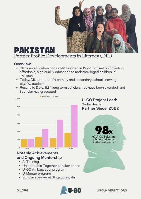 U-GO works with Developments in Literacy, an education non-profit with a 27 year history, to provide a pipeline for advancement for qualified young women from low-income backgrounds. Thus far, U-GO and DIL have provided 524 scholarships to women with high academic potential, deep financial need, and great motivation.