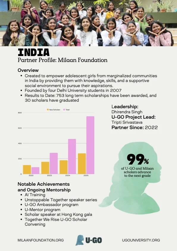 U-GO works with The Milaan Foundation and Buddy4Study to break down barriers making the opportunity for advancement open to all motivated and academically achieving women, providing financial scholarships and on-going mentorship through the duration of their schooling. To date, 1,521 scholarships have been funded.